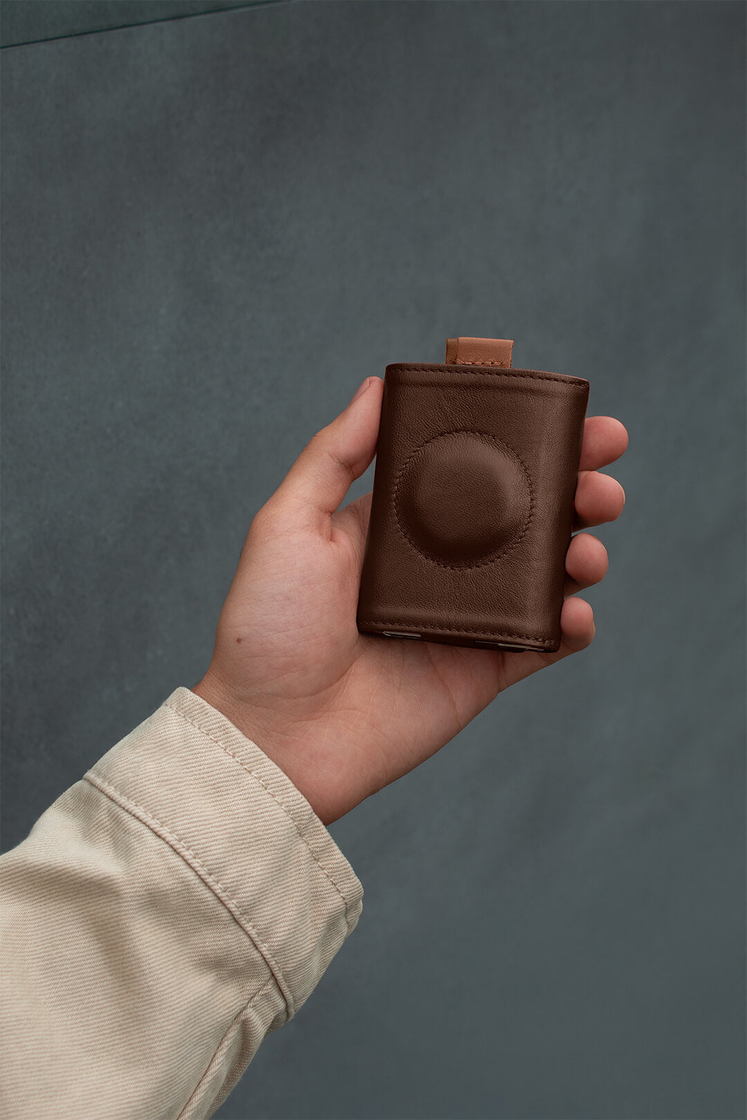 Black and brown leather case with a secret compartment for AirTag on a light gray background