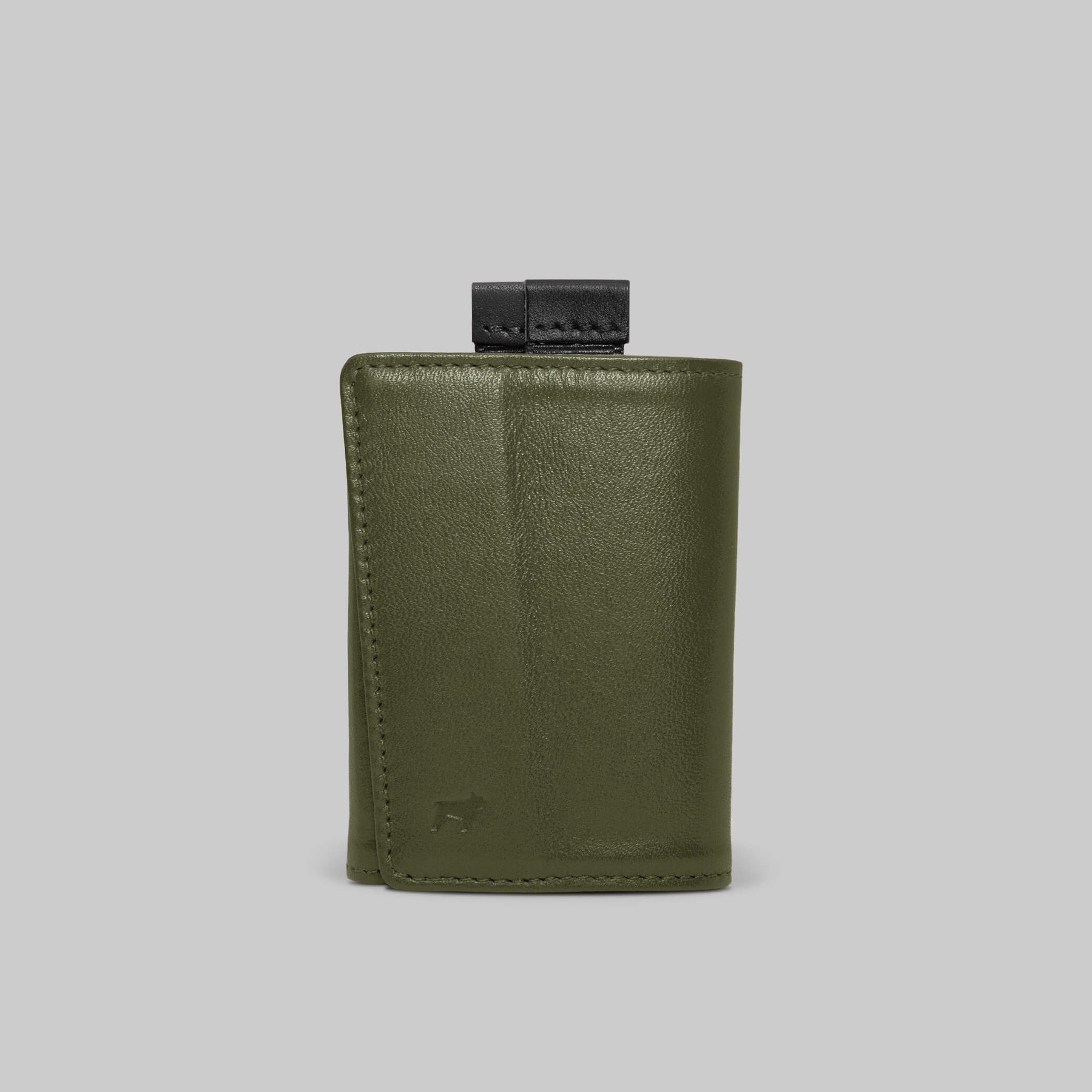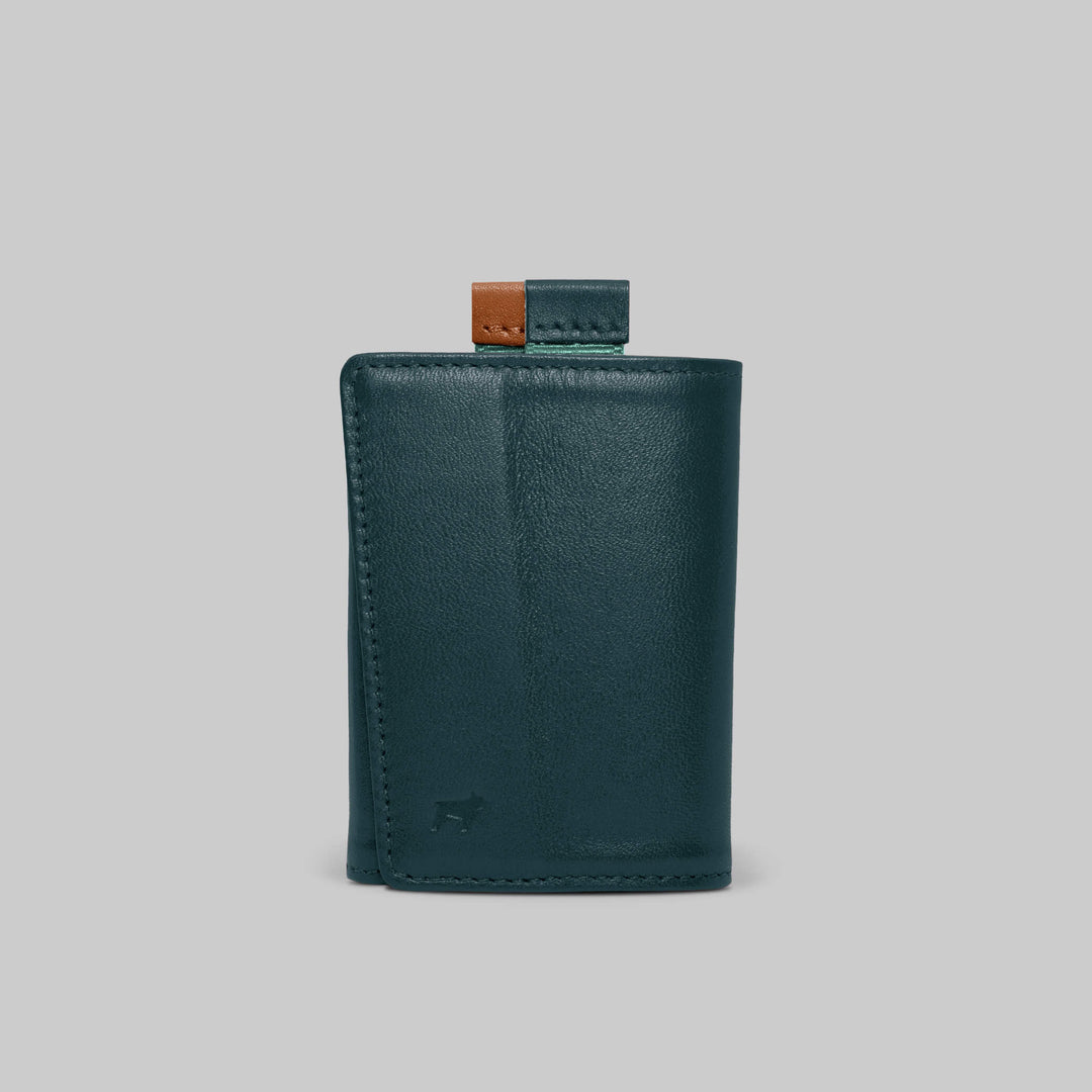 Green leather wallet with RFID anti-theft security feature on a light gray background