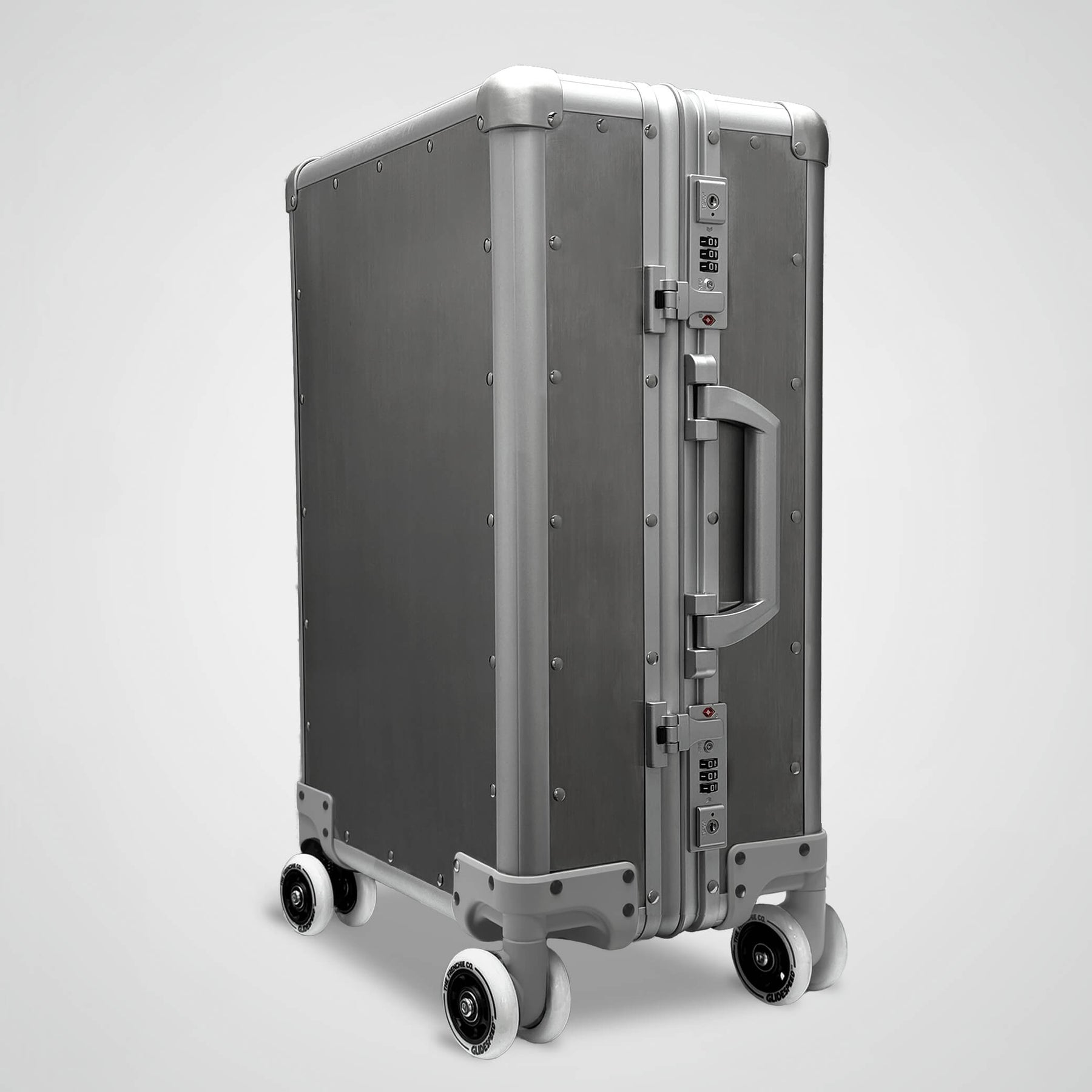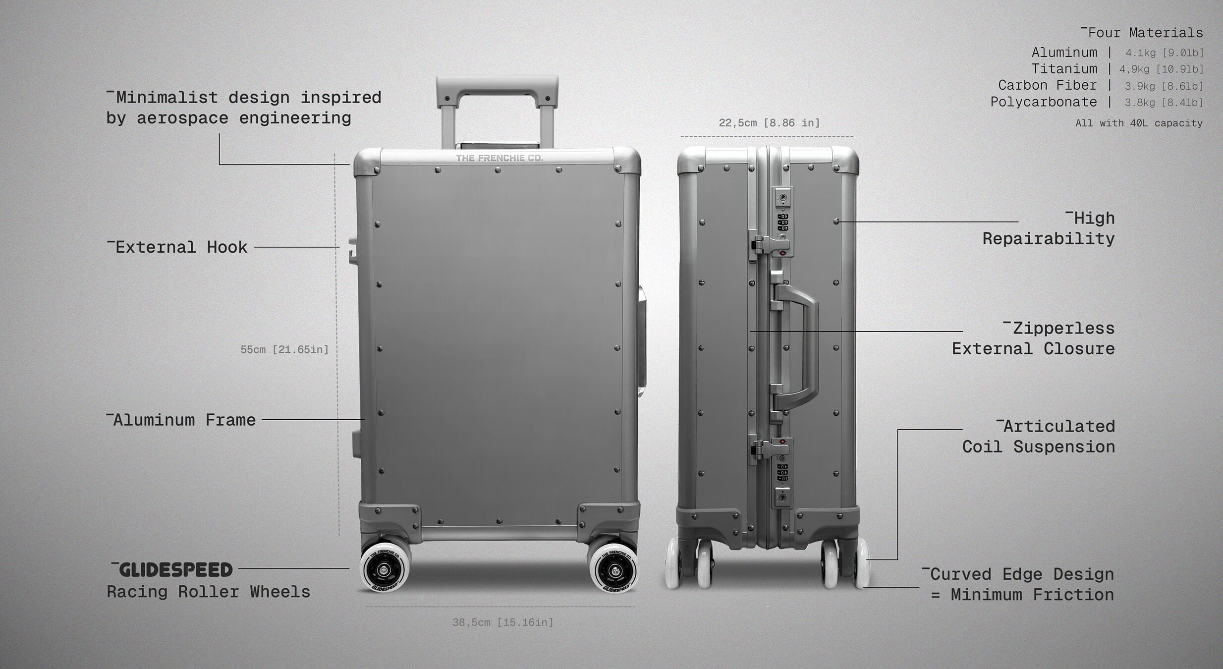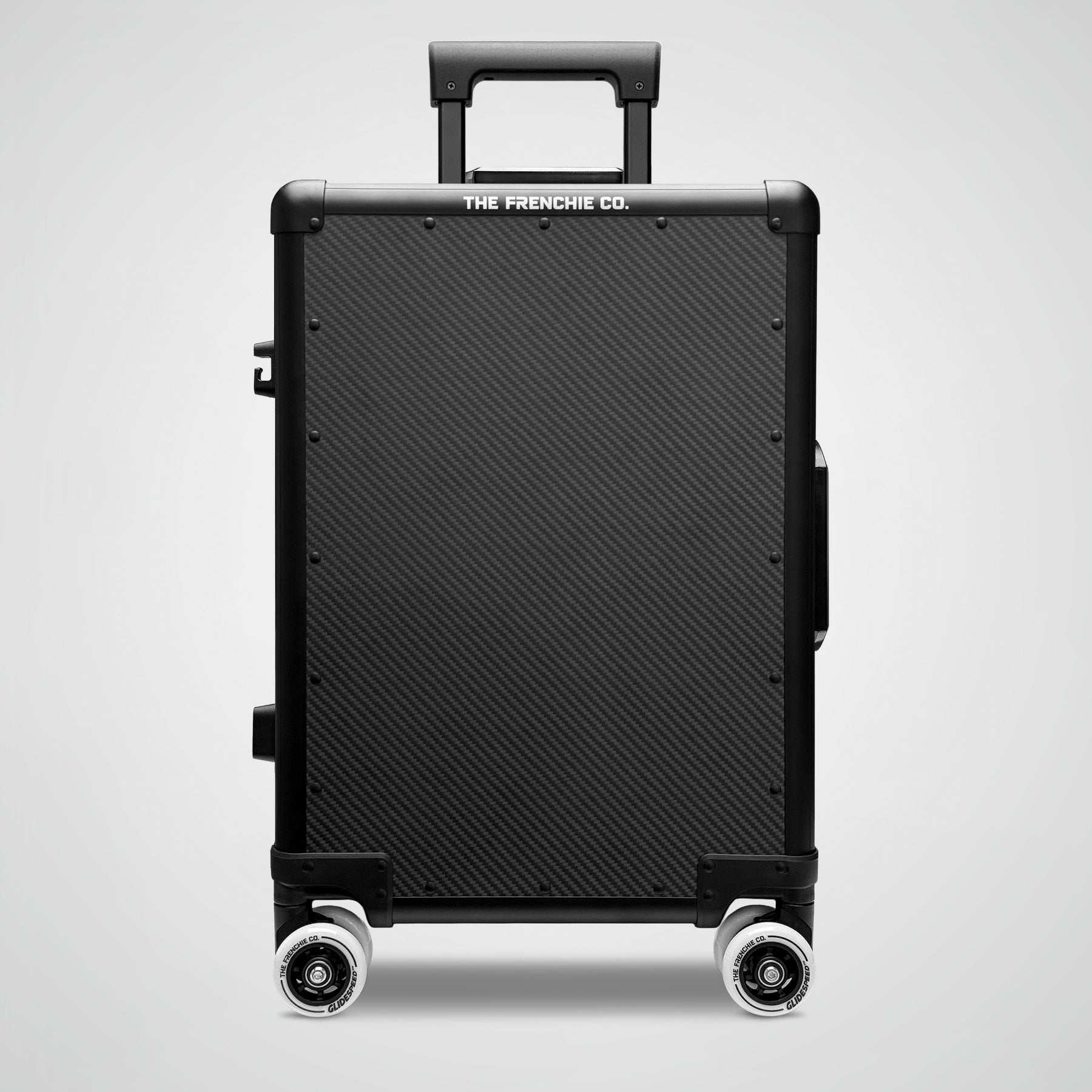 All First Edition GlideSpeed Carry-On models are included: Polycarbonate, Aluminum, Carbon Fiber, and Titanium. Each features our patented Articulated Coil Suspension and Racing Roller Wheels for the smoothest ride in travel.
