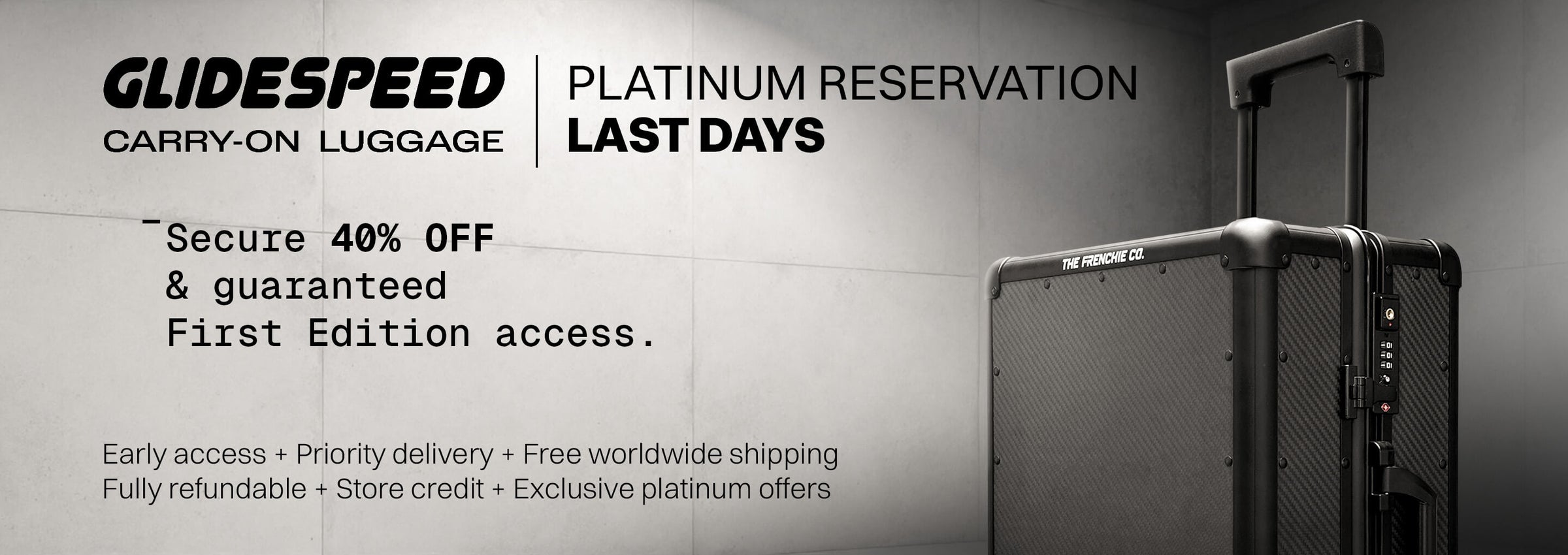 The Platinum Reservation does not include the purchase of the carry-on itself. It secures your right to buy a First Edition GlideSpeed Carry-On at a 40% discount once the official sale begins. As a Platinum Member, you’ll also receive exclusive perks, early access, free shipping, and a $20 coupon for future purchases.